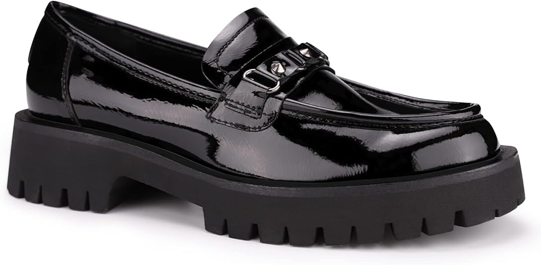 ISOMEI Women's Chunky Heel Loafers Platform Patent Leather Chunky Loafers Leather Shoes with Metal