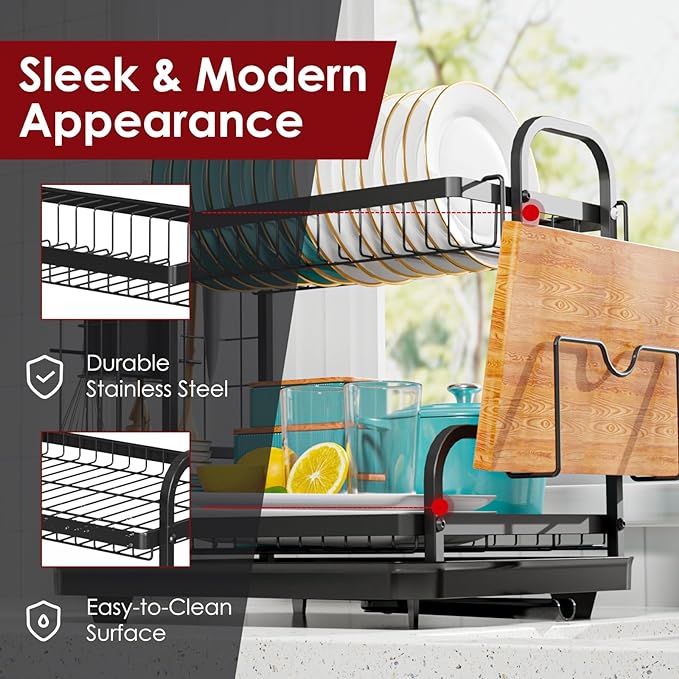 Sakugi Dish Drying Rack for Countertop - Rustproof Space-Saving & Multipurpose 2-Tier Dish Rack for Kitchen Counter with Utensil Holder, Large-Capacity, Black